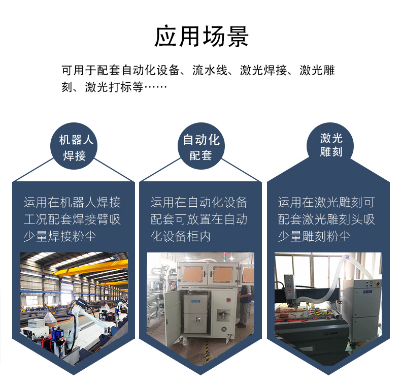 机器人焊接、自动化设备、自动流 水线、PCB、精密激光雕刻、精密 激光切割等配套吸尘。