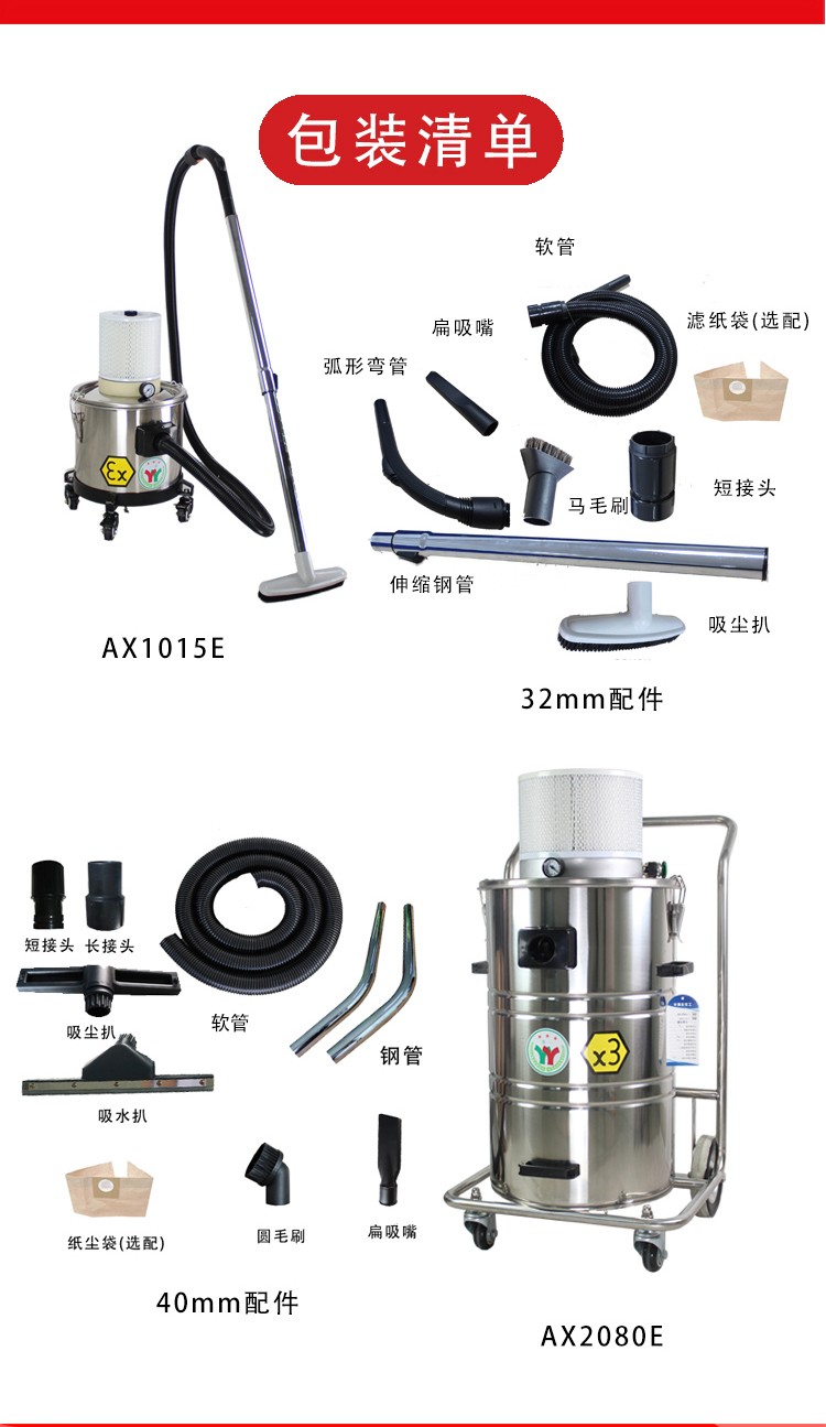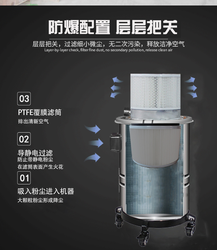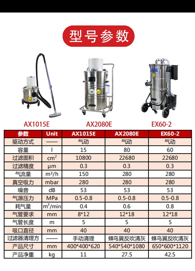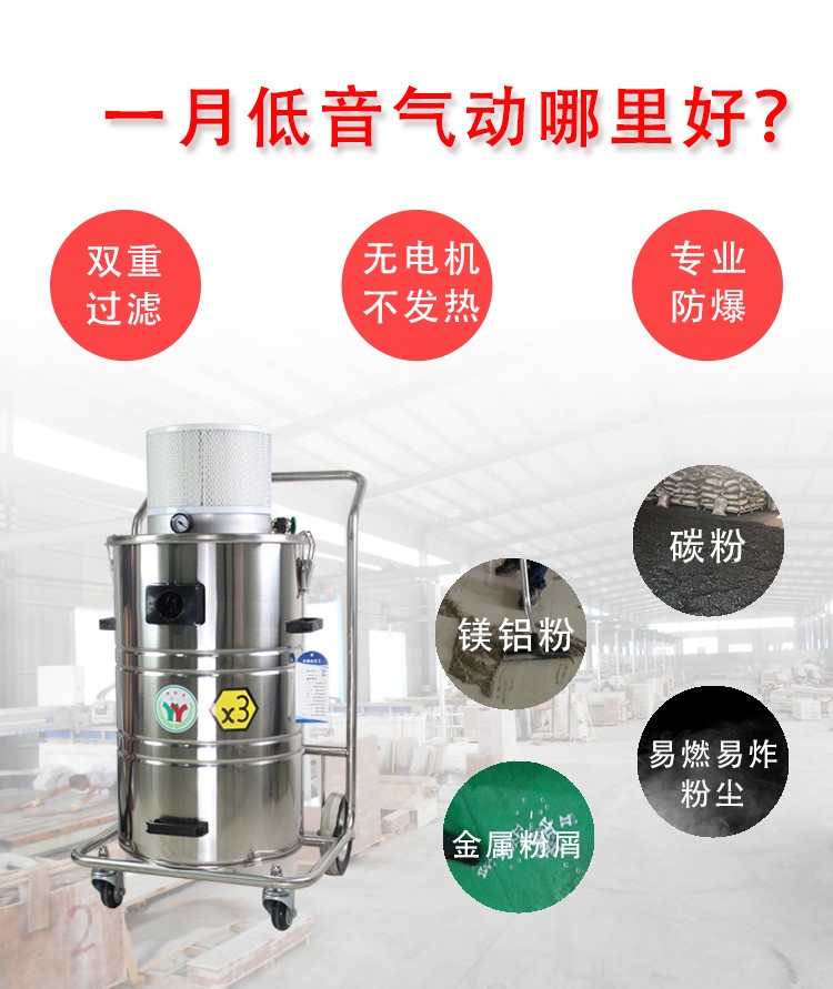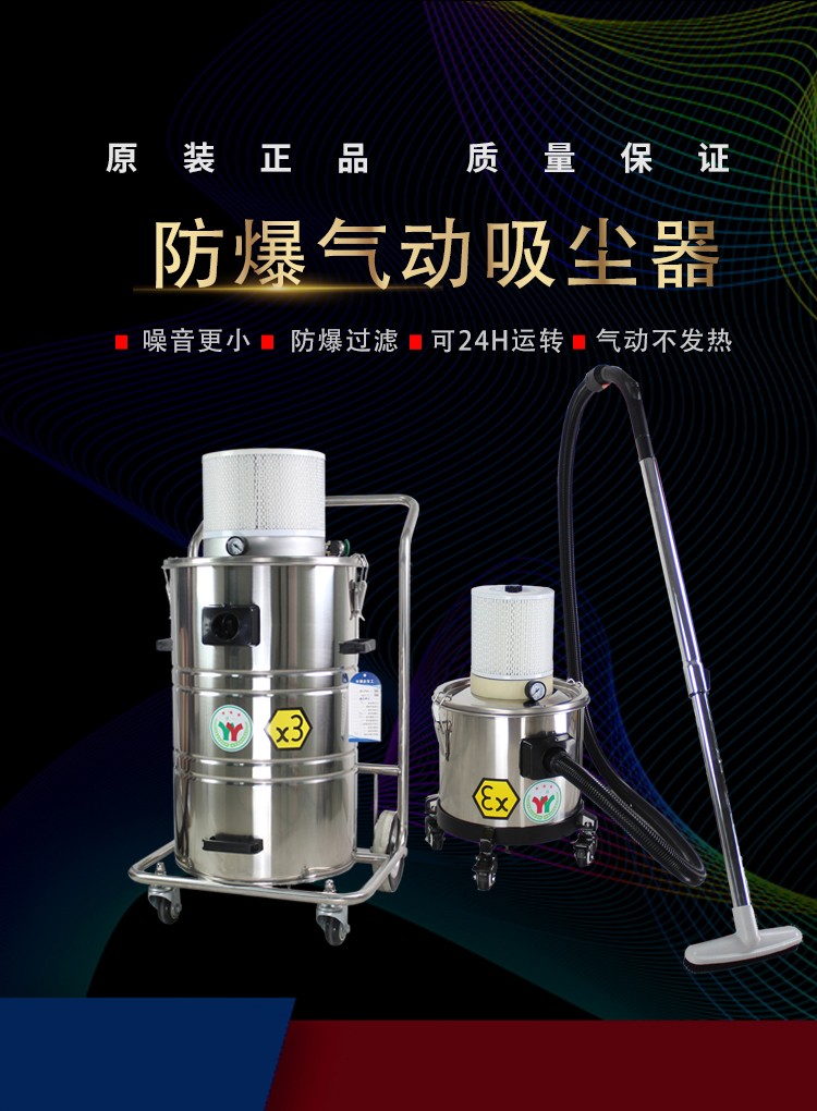 本系列产品属于气动防爆吸尘器,适用于具有爆炸性粉尘环境的 21 区和 22 区,用于清理回 收少量爆炸性粉尘的设备,广泛用于石油化工、航空航天、军工、化学制药、食品、3D 打 印、齿科、喷涂等行业。适用于粉尘处理量较少的工业环境长时间连续作业。