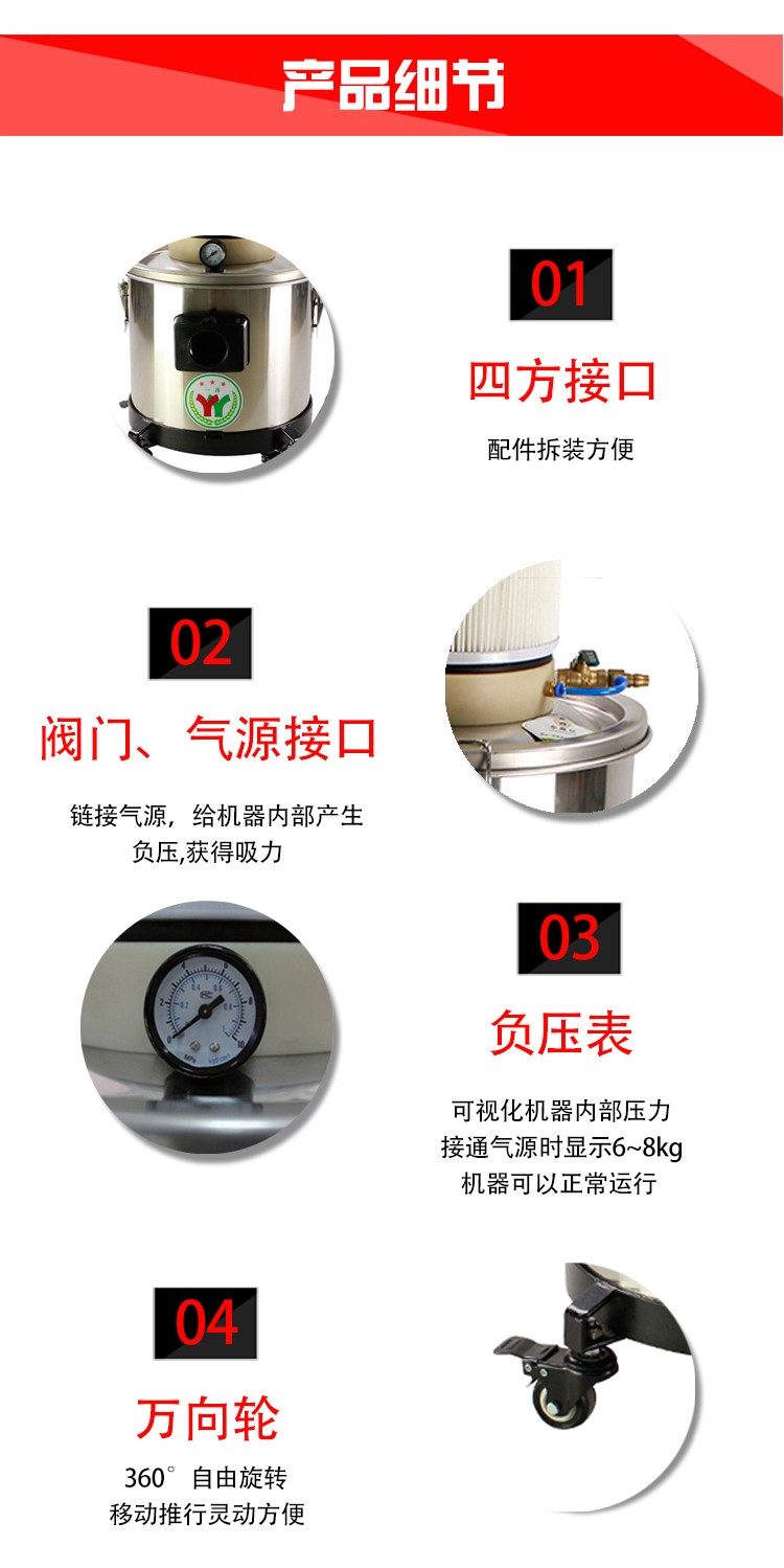 4. 机器噪音小,吸力强。可配套生产线或设备使用。
