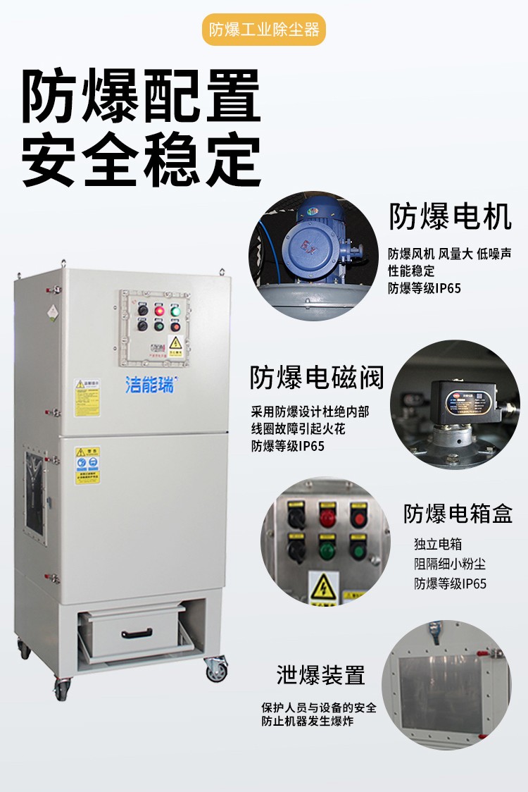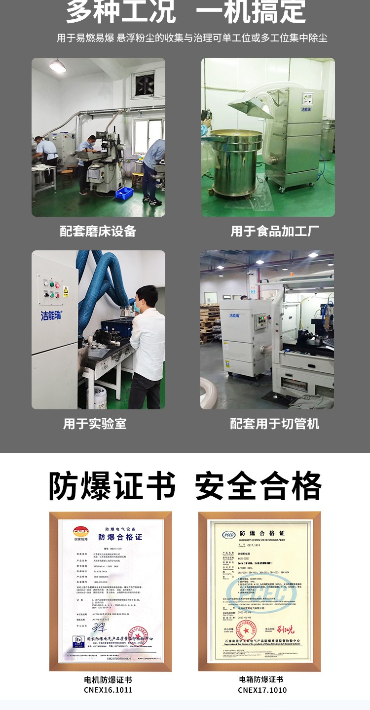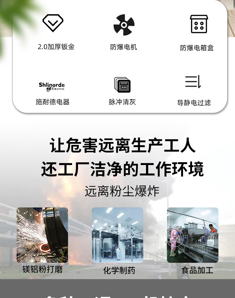 适用于有防爆要求的场所,喷砂、喷粉、雕刻、 铸造、打磨抛光、搅拌、破碎、粉体输送、粉体 投料、粉体装袋、焊接切割、激光切割、化工落 料、实验室、钻孔等工况除尘,多用于飘浮、悬 浮粉尘的收集与治理可单工位或多工位集中除尘。