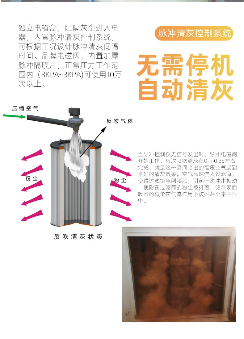 内置脉冲清灰系统,可根据工况设定脉冲清灰间隔时间。