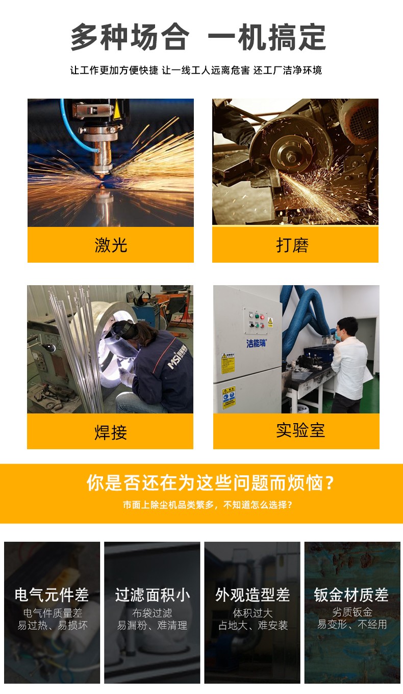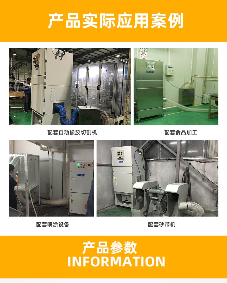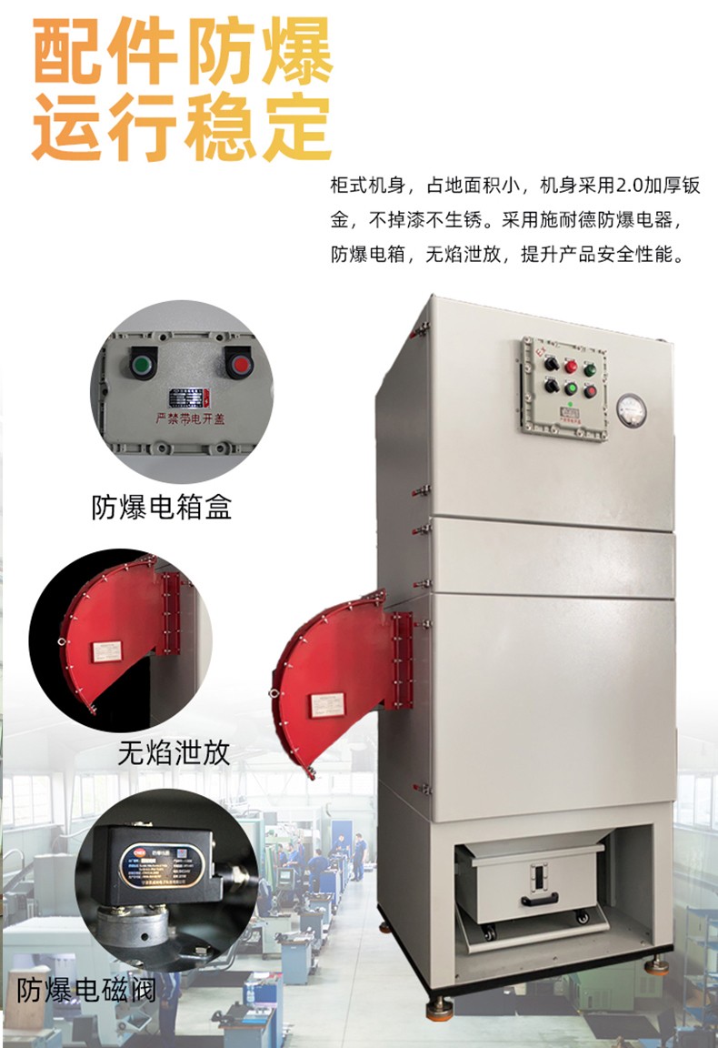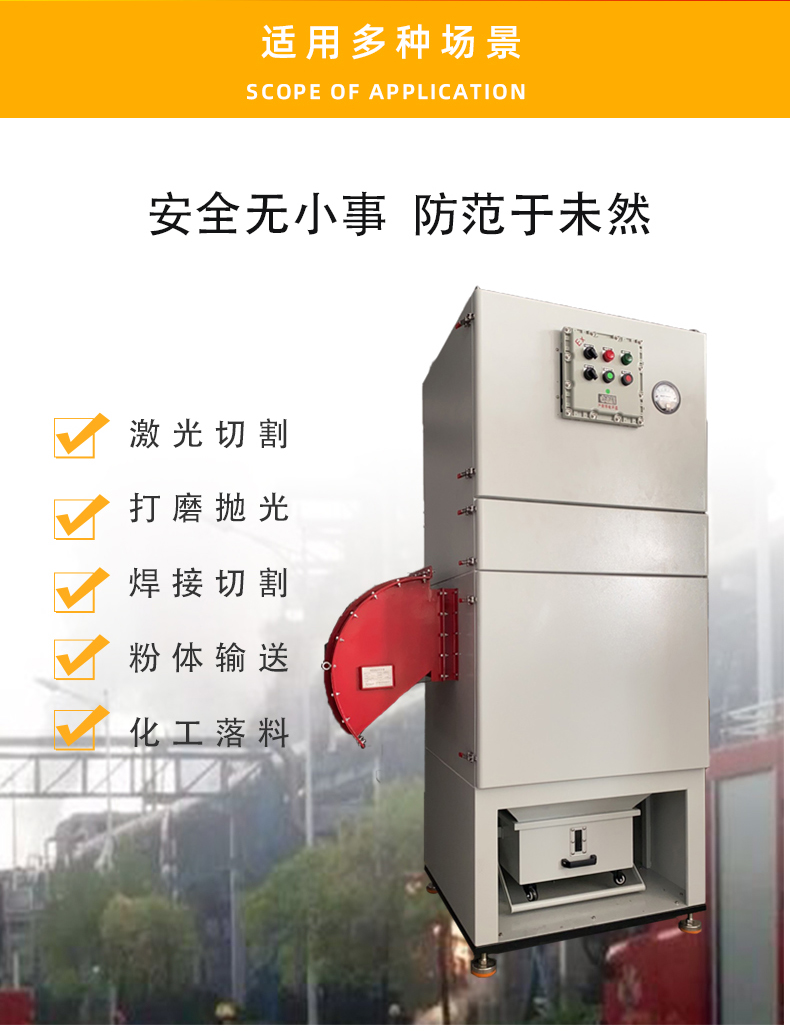 适用于有防爆要求的场所,喷砂、喷 粉、雕刻、铸造、打磨抛光、搅拌、破 碎、粉体输送、粉体投料、粉体装袋、 焊接切割、激光切割、化工落料、实验 室、钻孔等工况除尘,多用于飘浮、悬 浮粉尘的收集与治理可单工位或多工位 集中除尘。