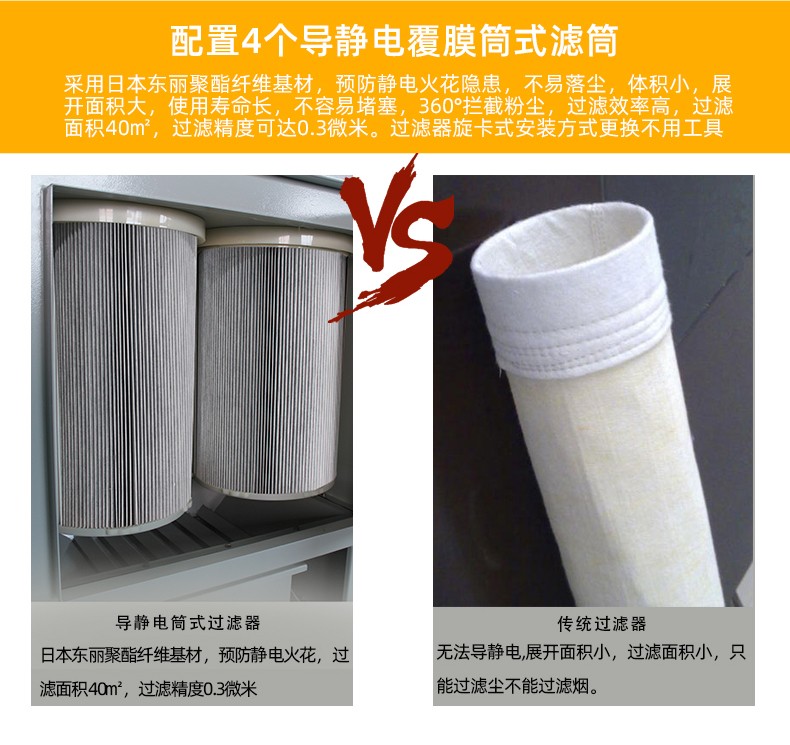 2 个导静电筒式过滤器,过滤精度 0.3μm,过滤面积达 16m²,过滤器旋卡式安装方 式更换不用工具。